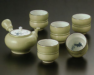 日本トップクラスの陶磁器、有田焼の茶器セットです。清潔感のある青磁に加え、さりげなく湯のみの中に描かれた絵柄が粋な逸品です☆