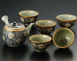 日本トップクラスの陶磁器、有田焼の茶器セットです。唐草模様と桔梗が