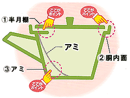 Bのアミで大きなアミと胴体との空間により、茶葉がつまりにくくなっています。また、細かいアミ目(50メッシュ)なので、深むし茶や粉茶にも対応できます。